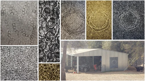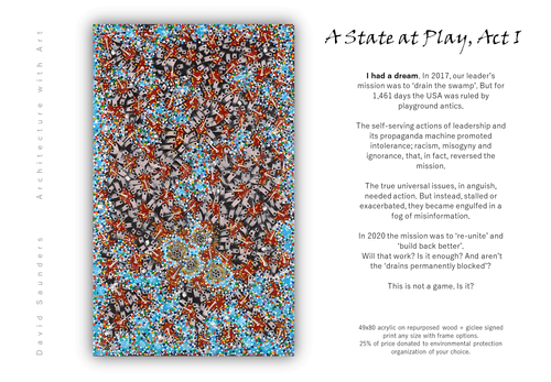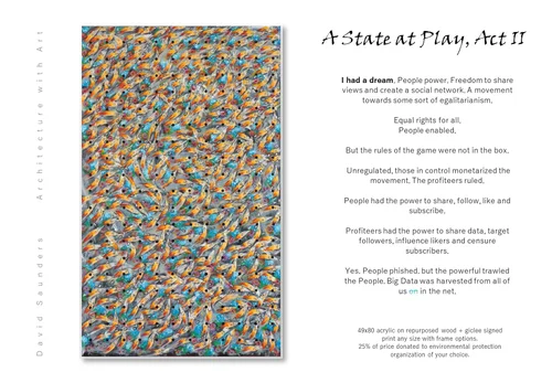 The paint thickened foundation depicting darkened layers of chains and a weathered length of rope lying coiled on the ground, represent restraint, oppression and the perpetration of violence. The taut ‘cross’ dissecting the coil suggests the perpetrators of such acts choose to bestow their favors during religious holidays to liken themselves to these worshipped entities. They may also believe that doing so will provide absolution for their sins, thereby freeing them from their pasts so that they may once again take up their mantels of violence and intimidation, unburdened. The scattered ‘oak apples’, which are parasitic round galls created when a wasp impregnates a leaf with chemicals that alter the leaves’ growth to a form that the wasp’s larvae can feed upon, represent the human equivalent who, by manipulation, threats and intimidation, disrupt the balance of society.